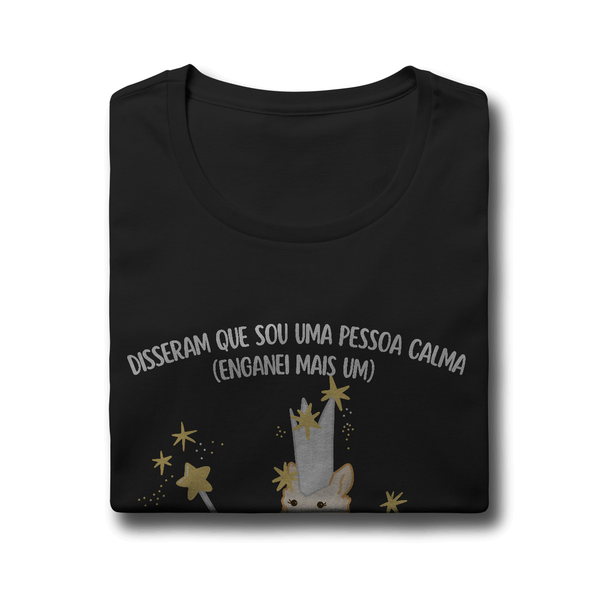 Você já enganou alguém com a sua falsa calma hoje? A estampa "Disseram que sou uma pessoa calma (enganei mais um)" é o retrato perfeito de quem sorri por fora e surta por dentro. Um toque de fada, um toque de caos: pura representatividade em forma de meme fashion! Ideal pra quem é paz… até que mexam com ela.