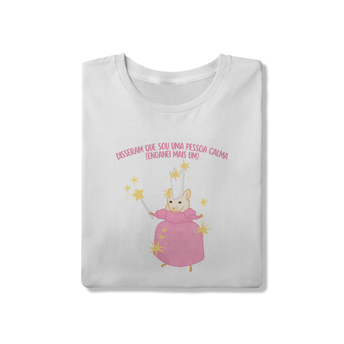 Você já enganou alguém com a sua falsa calma hoje? A estampa "Disseram que sou uma pessoa calma (enganei mais um)" é o retrato perfeito de quem sorri por fora e surta por dentro. Um toque de fada, um toque de caos: pura representatividade em forma de meme fashion! Ideal pra quem é paz… até que mexam com ela.