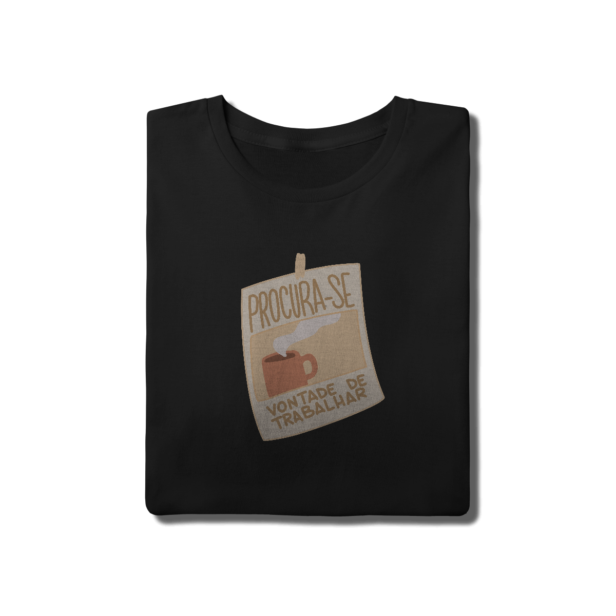 Procura-se: vontade de trabalhar. Última vez vista foi na adolescência, antes dos boletos aparecerem. Essa estampa é o desabafo perfeito de quem só levanta pra trabalhar porque o café chamou — não a motivação.
